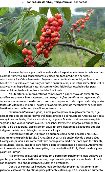 O Brasil é o maior produtor de Guaraná do mundo, com 96% das plantações concentradas nos estados do Amazonas e Bahia. Devido a seus compostos bioativos, o Guaraná tem atraído um interesse considerável como ingrediente para o desenvolvimento de alimentos funcionais, suplementos alimentares, medicamentos e cosméticos.