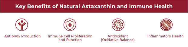 Estudos mostram que a astaxantina possui ação anti-inflamatória tanto sistematicamente como localizada em vários órgãos, como o pulmão. Foi observado que o consumo constante de astaxantina pode levar a uma redução nos níveis sistêmicos da proteína C-reativa, um indicador importante das inflamações [2] [1].