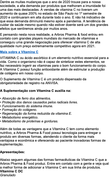 E pensando nesta nova realidade, a Arbros Pharma & food entrou em contato com grandes players mundiais do mercado de vitaminas e conseguiu uma grande negociação para oferecer vitamina C de alta qualidade num preço extremamente competitivo agora em 2021.